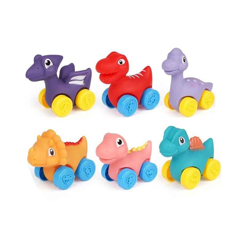 Set di 6 figure di dinosauri morbide in gomma con ruote, realizzate in materiale atossico e design colorato. Adatto per neonati e età prescolare (da 1+) e conforme agli standard di sicurezza.
