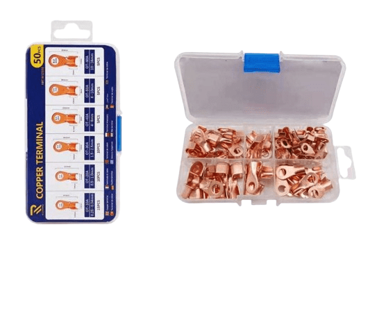Il set include 50 terminali per cavi in rame in 6 diverse dimensioni, posizionati in una pratica scatola con divisori.