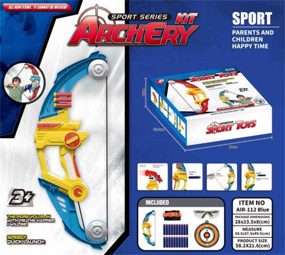 Include un grande arco, frecce con ventosa, un bersaglio e accessori.