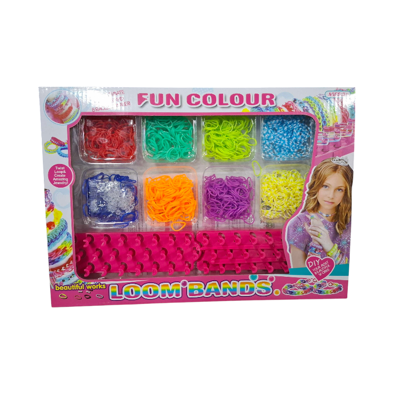 Set per la creazione di braccialetti elastici fai-da-te con una varietà di elastici colorati, una pratica base per l’intreccio e tutti gli strumenti necessari per realizzare le tue meravigliose creazioni come desideri!
