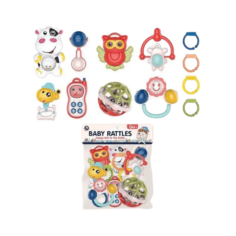 Sonagli e mordicchi per neonati realizzati con materiali sicuri e non tossici, in splendidi design e colori, con maniglie per un facile utilizzo. Il set include 12 pezzi.