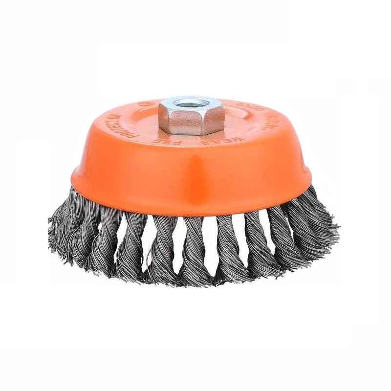 Spazzola a campana in filo metallico da 65mm con struttura intrecciata e setole in ferro, con filettatura M14×2 per smerigliatrici angolari. Ideale per la rimozione di ruggine, vernice e per la pulizia di superfici metalliche.