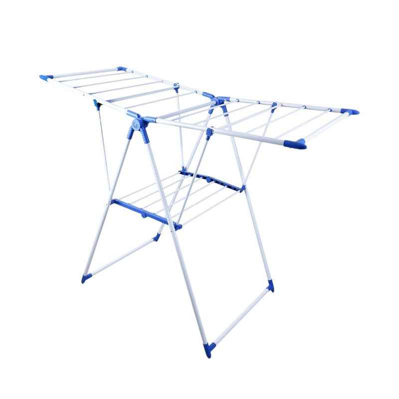 Pratico stendibiancheria da pavimento con struttura metallica e molteplici posizioni per i vestiti.