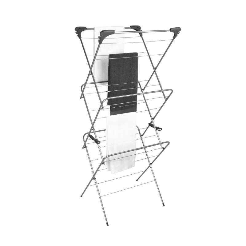 È dotato di una robusta struttura metallica e di appendini pieghevoli in plastica agli angoli.