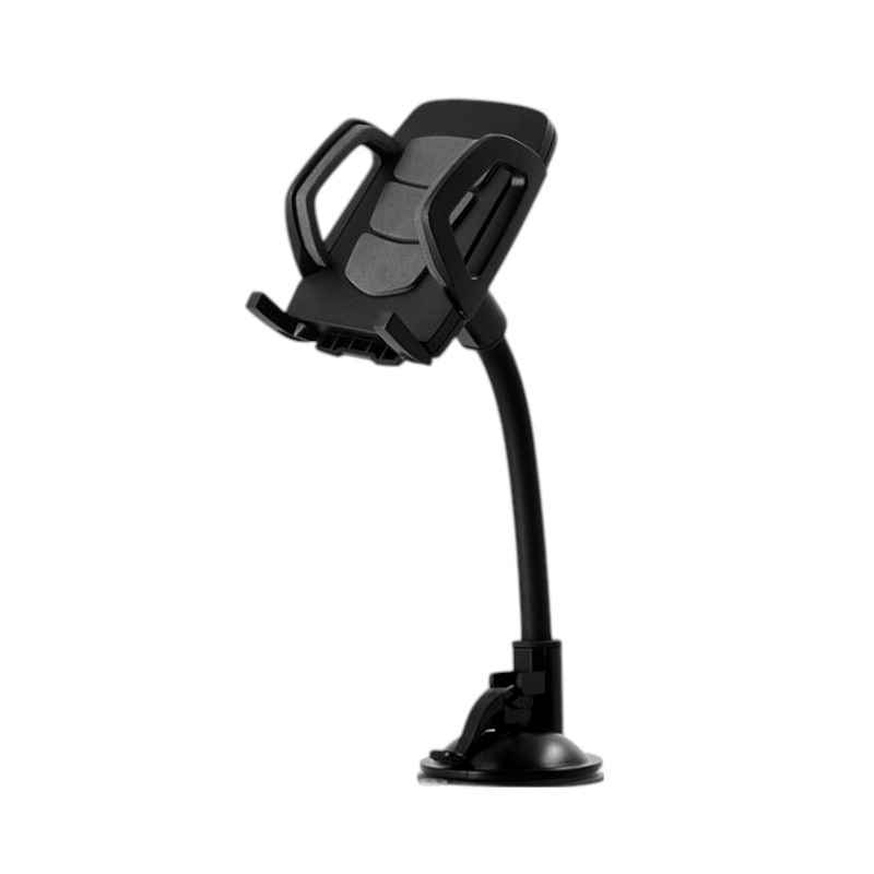 Supporto per smartphone per auto con ventosa potente o adesivo, braccio pieghevole e larghezza regolabile fino a 9 cm. Protezioni in silicone per una presa sicura e stabile.