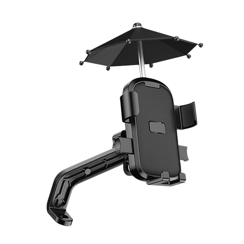 Supporto smartphone per bicicletta/motocicletta con ombrello parasole e testa inclinabile regolabile, da montare sul braccio dello specchietto retrovisore.