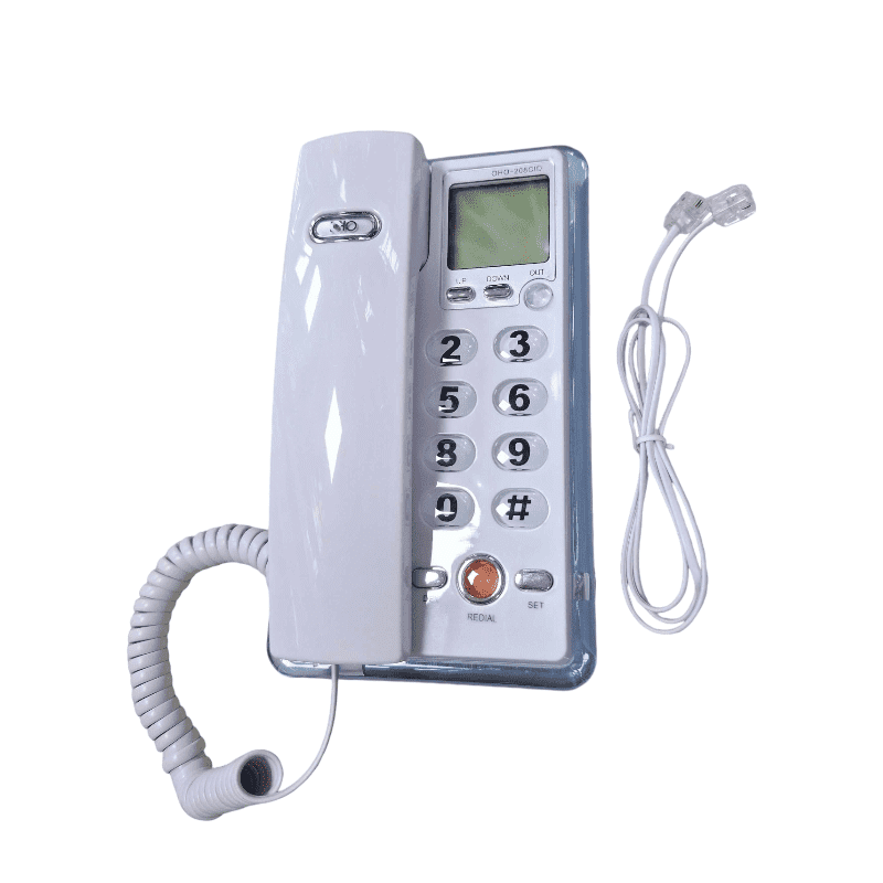 Telefono fisso cablato, adatto per uso domestico o professionale, come soluzione più pratica rispetto a un telefono cordless che necessita di ricarica regolare.