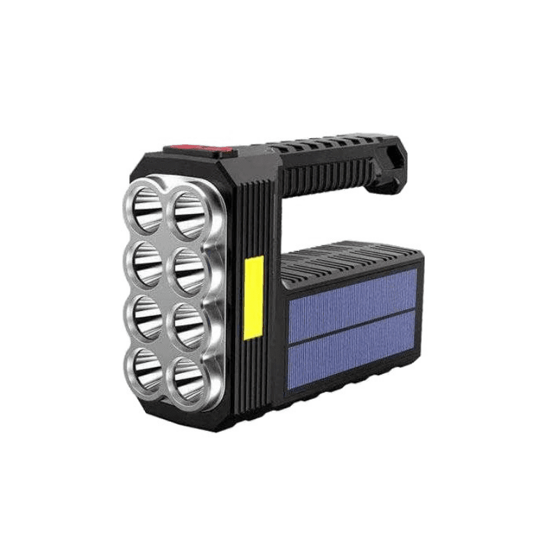 Torcia da lavoro LED ricaricabile con 3 livelli di illuminazione (forte, basso, lampeggiante), portata fino a 200 m, resistenza all’acqua IPX6 e ricarica tramite USB — batteria integrata compatta.