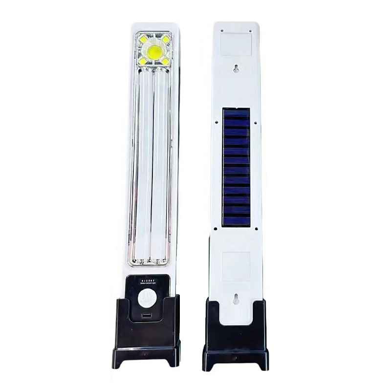 Torcia portatile ricaricabile LED 45W con pannello solare e ricarica USB. Doppia illuminazione (calda/fredda), fino a 10 ore di funzionamento, include cavo USB e supporto.