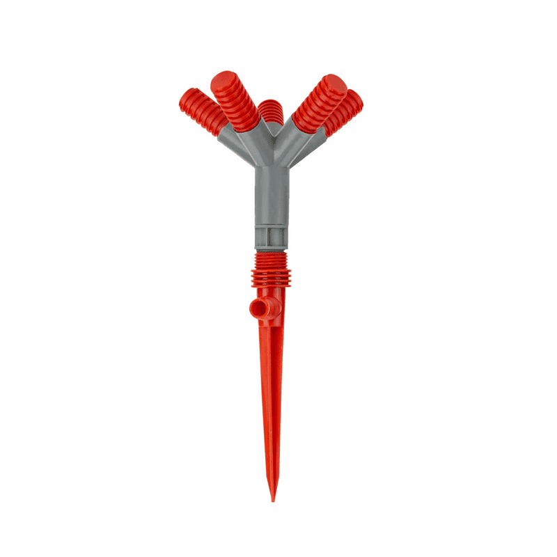 Irrigatore rotante con 5 ugelli e picchetto in plastica per il fissaggio al terreno. Copertura fino a 360° e resistenza alla pressione fino a 4 bar — ideale per giardini e prati.
