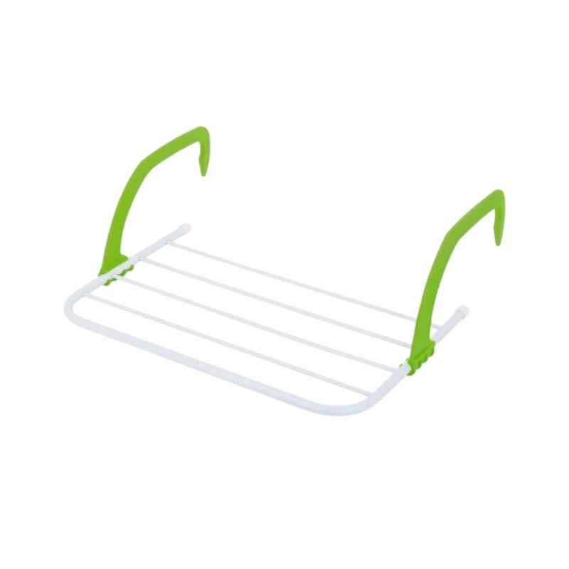 Απλώστρα ρούχων αλουμινίου με πλαστικές βάσεις σταθερής τοποθέτησης στο οριζόντιο κάγκελο και πρακτικό σχεδιασμό.