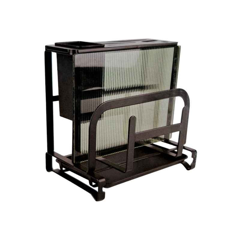 Μεταλλική βάση οργάνωσης για σκεύη κουζίνας με θέσεις για καπάκια, υποδοχή για βάση κοπής και χώρο για μαχαιροπίρουνα. Συμπαγής και εύκολη στο καθάρισμα, ιδανική για εξοικονόμηση χώρου στον πάγκο.