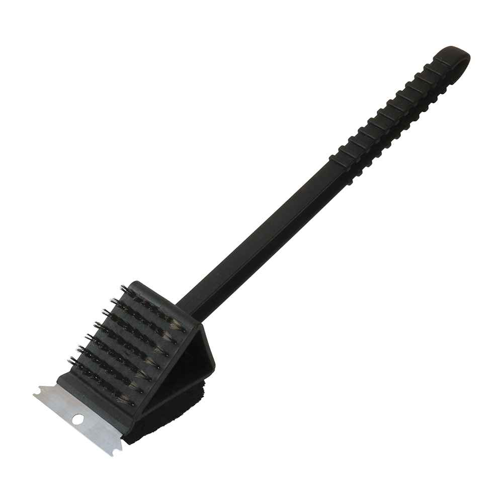 Η τρίγωνη κεφαλή έχει σχεδιαστεί για πλήρη και αποτελεσματικό καθαρισμό χάρη σε τρία συνδυασμένα στοιχεία: τις τρίχες από ανοξείδωτο ατσάλι, ιδανικές για την αφαίρεση καμένων υπολειμμάτων και επίμονων επικαθίσεων· το σφουγγάρι με υψηλή αντοχή στην τριβή, που λειαίνει και καθαρίζει τις επιφάνειες αφαιρώντας τον ανθρακοποιημένο λίπος· το ενσωματωμένο ξύστρα, ιδανικό για να αποκολλά τα πιο συμπαγή υπολείμματα ανάμεσα στις σχάρες. Ένα πραγματικό σύστημα καθαρισμού τριπλής δράσης που εξασφαλίζει γρήγορα αποτελέσματα ακόμα και μετά από μακρές ψησίματα.