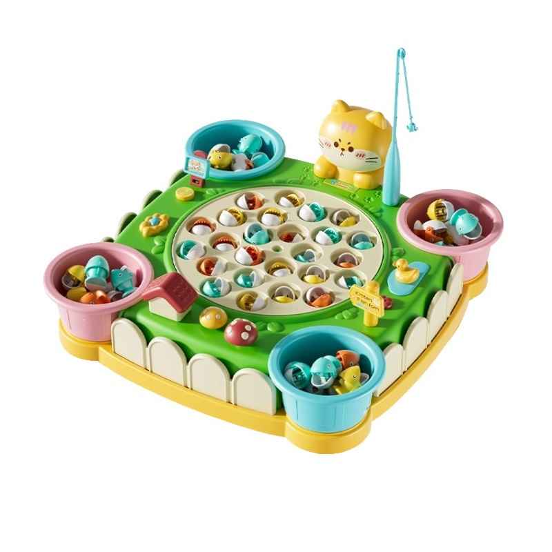 Υπέροχο παιχνίδι ψαρέματος, περιστρεφόμενο, με ψαράκια τα οποία ανοιγοκλείνουν το στόμα τους, σε πρακτικό τραπεζάκι με πολύχρωμο σχεδιασμό.