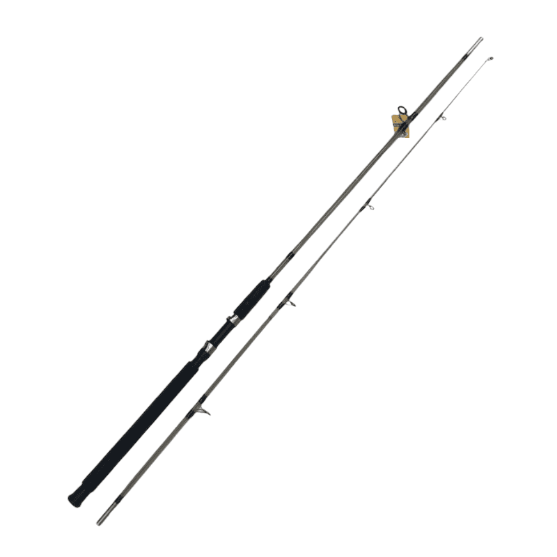 Καλάμι ψαρέματος δίσπαστο, διάφανο, από ενισχυμένες ίνες, οπλισμένο με οδηγούς και εργονομική λαβή υψηλής ποιότητας.