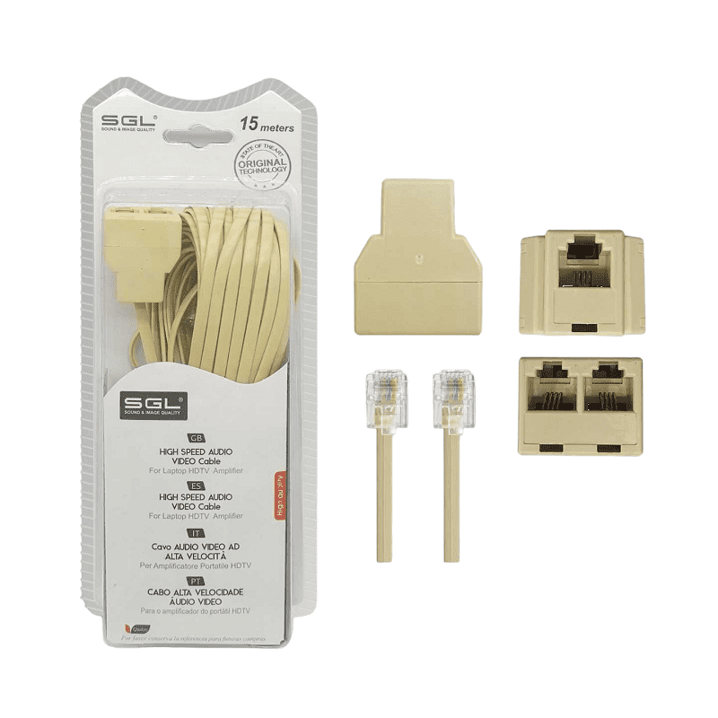 Καλώδιο γραμμής τηλεφώνου πλακέ, 6P4C1-2 με διακλαδωτή 2 εξόδων. Μήκος: 15m.