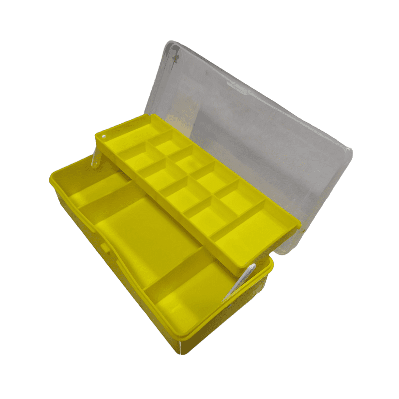 Πλαστικό κουτί-κασετίνα με 2 επίπεδα, ιδανικό για την αποθήκευση και μεταφορά των αξεσουάρ αλιείας σας, με πολλαπλές θήκες και διαχωριστικά.