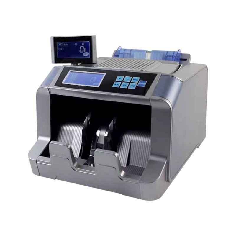 Ηλεκτρονικός καταμετρητής χαρτονομισμάτων με ταυτόχρονη ανίχνευση πλαστών UV & MG, ταχύτητα 900 τεμ/λεπτό και χωρητικότητα 200 χαρτονομισμάτων. Υποστηρίζει λειτουργία δεσμίδας (batch), 4-ψήφια LCD οθόνη και τροφοδοσία AC