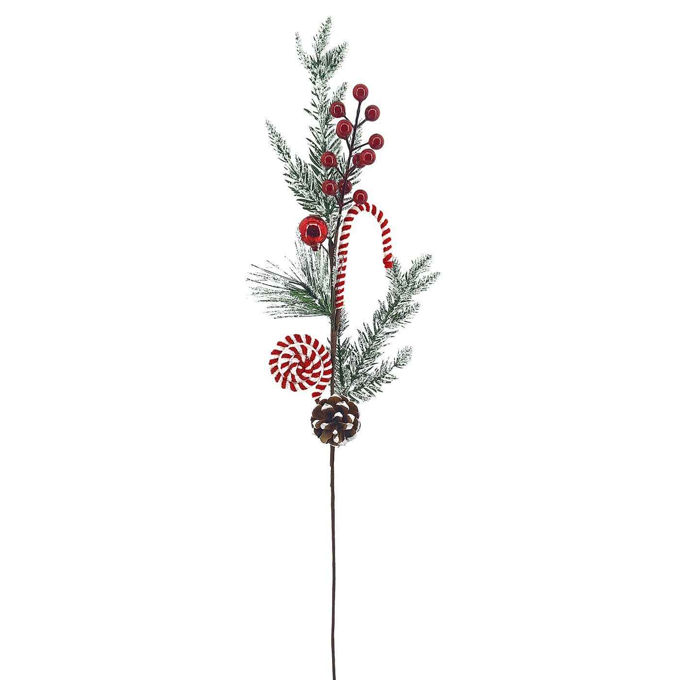 Ramo decorativo lungo 70 cm con lecca-lecca, pigna naturale marrone e agrifoglio, progettato per una facile collocazione su albero, ghirlanda o decorazioni centrali. Ideale per composizioni natalizie, offre colore e texture senza manutenzione complessa, è resistente e riutilizzabile ogni stagione.