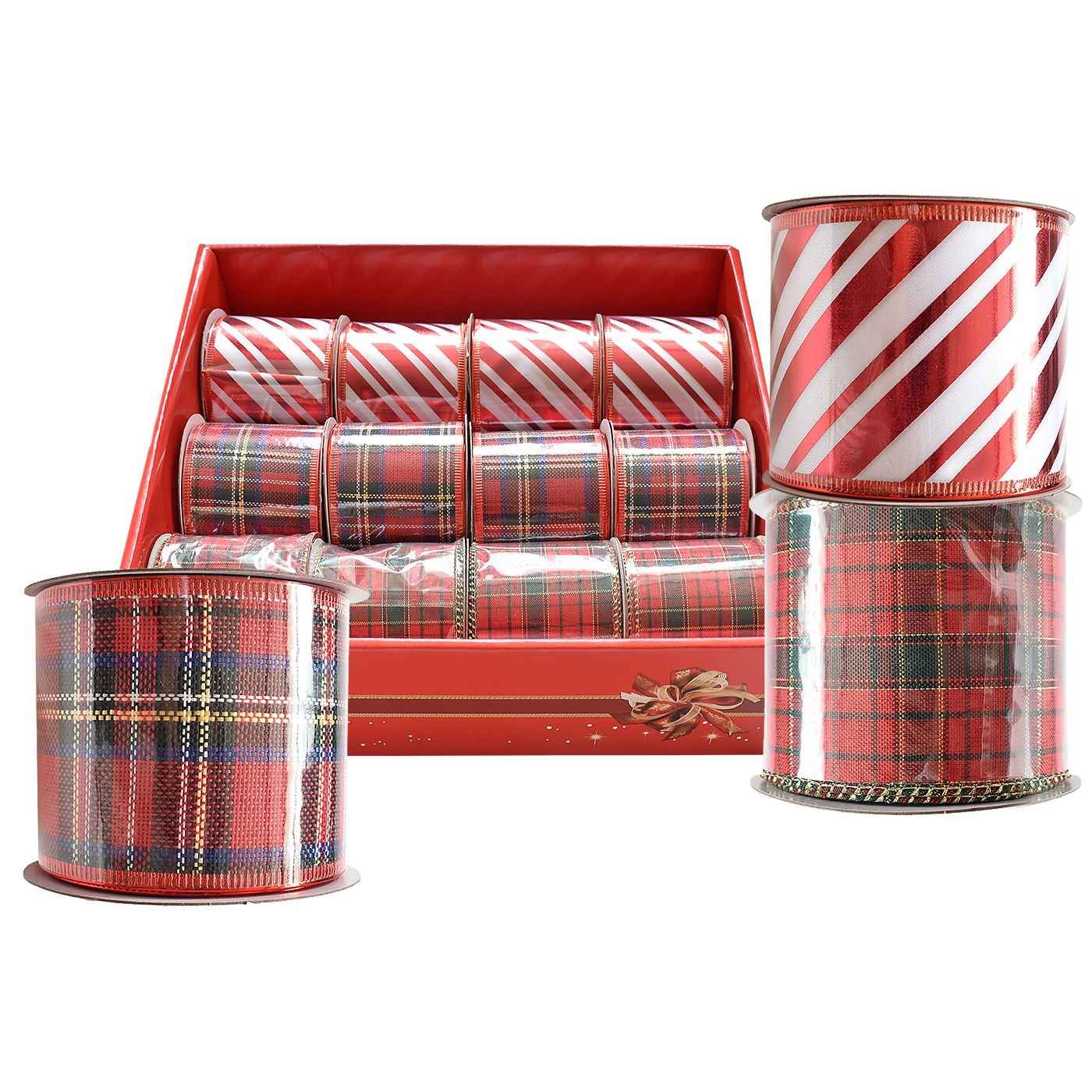 Set di nastri di Natale in tre diversi modelli (a quadretti e a righe), ogni nastro 6,3 cm x 5,5 m.