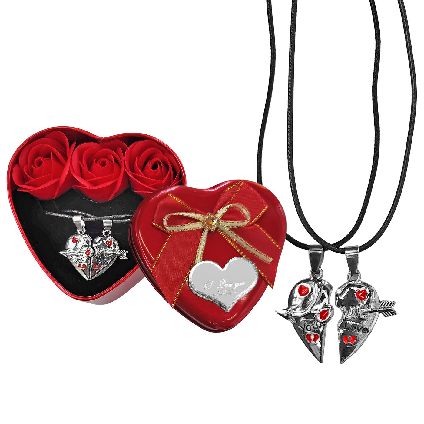 Σετ=μεταλλικό κουτί καρδιά, 3 τριαντάφυλλα & 2 κολιέ 9x9x4,5cm