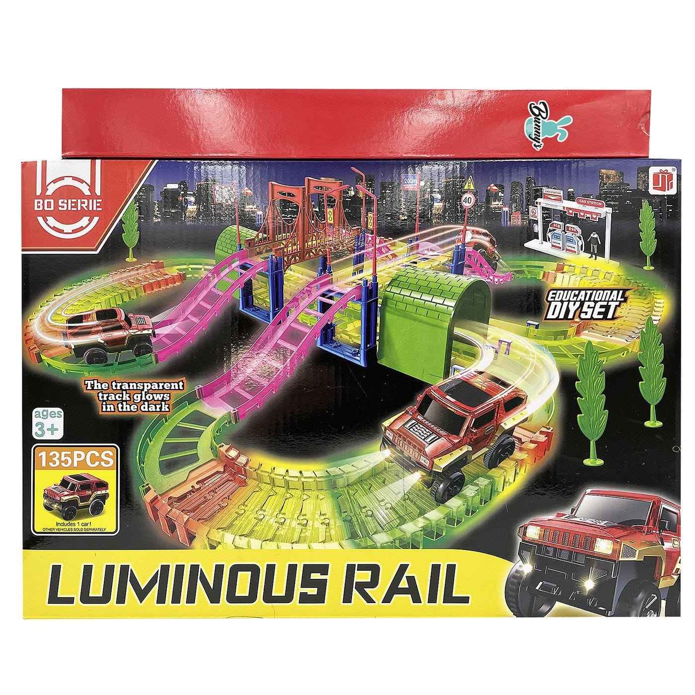 Φωσφορίζον σετ αυτοκινητόδρομου με ενσωματωμένη γέφυρα, σχεδιασμένο για παιχνίδι σε εσωτερικούς χώρους. Οι διαστάσεις του σετ είναι 39x27x7 cm, προσφέροντας συμπαγές αλλά διασκεδαστικό χώρο παιχνιδιού που φωτίζεται στο σκοτάδι για πιο εντυπωσιακή εμπειρία. Ιδανικό για παιδικά δωμάτια και χώρους δημιουργικού παιχνιδιού, προσελκύει με τον φωσφορίζοντα σχεδιασμό και τη λειτουργικότητα πίστας-γέφυρας.
