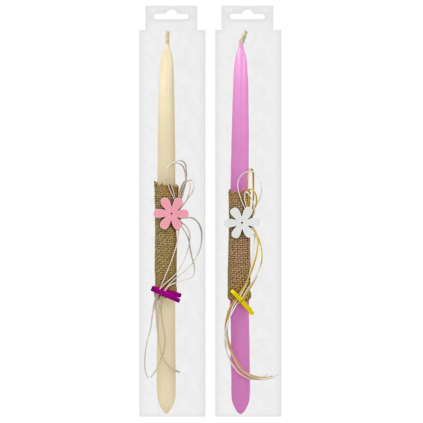 Διακοσμητική πασχαλινή λαμπάδα ύψους 37 cm με ξύλινο λουλούδι ως κεντρικό στοιχείο. Ιδανική για πασχαλινές τελετές και ως δώρο, προσφέρει διαχρονική όψη και φυσική υφή χάρη στο ξύλινο διακοσμητικό. Συνδυάζεται εύκολα με πασχαλινή διακόσμηση και τραβάει την προσοχή χωρίς υπερβολές.