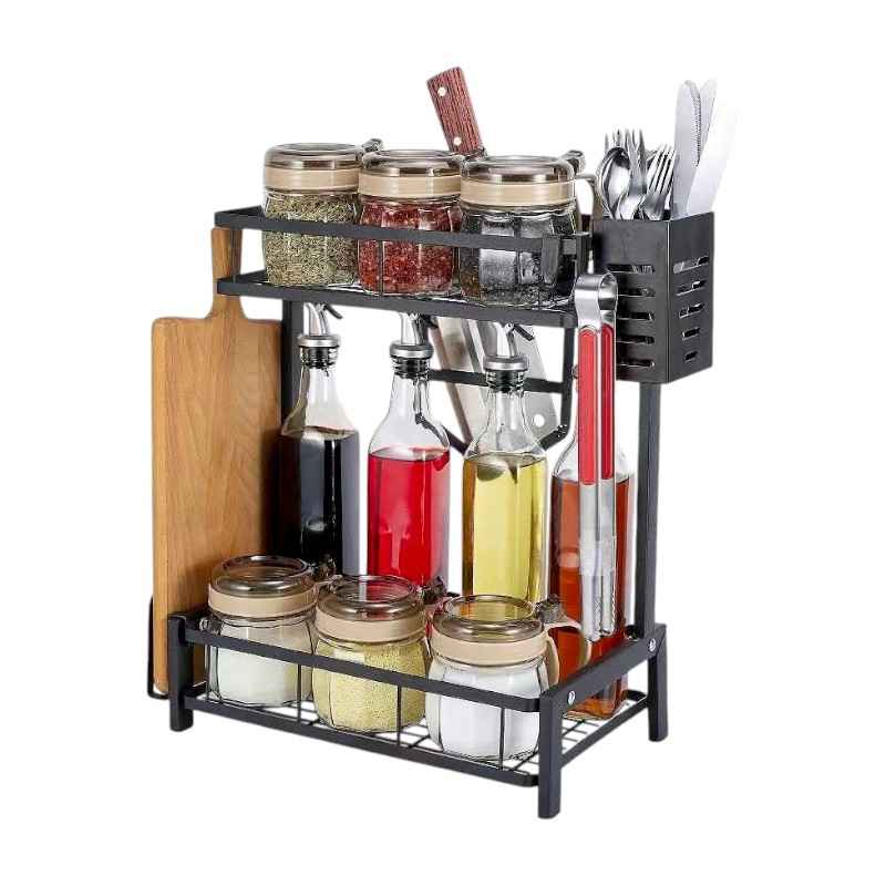Μεταλλική ραφιέρα οργάνωσης πάγκου κουζίνας ανοξείδωτη, με 2 ράφια κατάλληλα για τρόφιμα και δοχεία και με πρακτικές θήκες για μαχαιροπίρουνα και βάση κοπής.