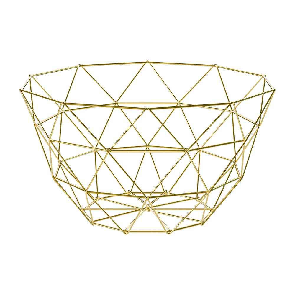 Μοντέρνο καλάθι φρούτων από βαμμένο χάλυβα με χρυσό φινίρισμα 26x14cm. Ελαφρύ και ανθεκτικό, με γεωμετρικό σύρμα για φυσικό αερισμό, εύκολο καθάρισμα και κομψή εμφάνιση ως κεντρικό διακοσμητικό.