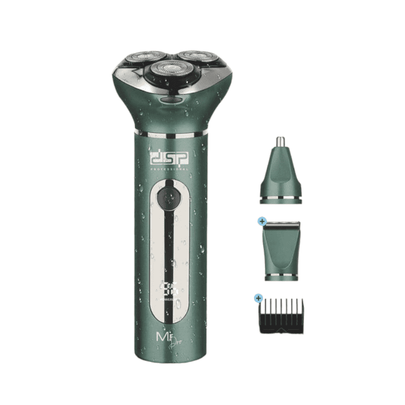 Επαναφορτιζόμενη ξυριστική μηχανή της DSP με εργονομικό σχεδιασμό και 3 κυκλικές λεπίδες που προσαρμόζονται στις καμπύλες του προσώπου, για βαθύ ξύρισμα και μέγιστο αποτέλεσμα χωρίς ερεθισμούς. Το σετ διαθέτει 2 επιπλέον κεφαλές, κατάλληλες για trimming και περιποίηση μύτης/αυτιών.