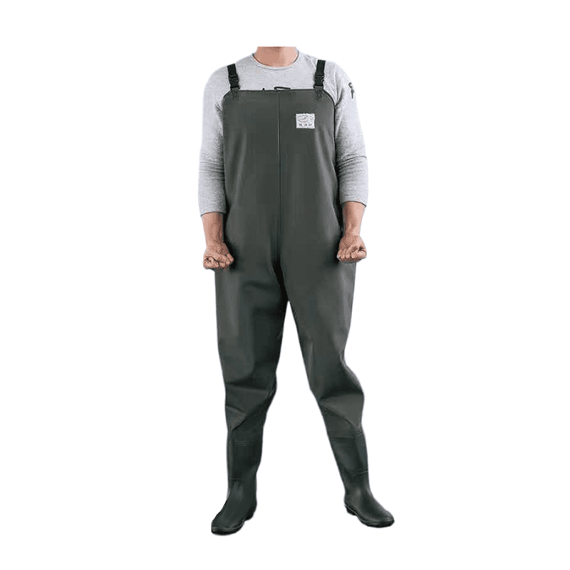 Ολοσωμη αδιαβροχη φορμα με ενσωματωμενη γαλοτσα και αντιολισθητικο πατο. Ρυθμιζομενες τιραντες με κλιπς για ανεση στην εφαρμογη, ιδανικη για ψαρεμα και εξωτερικες εργασιες.