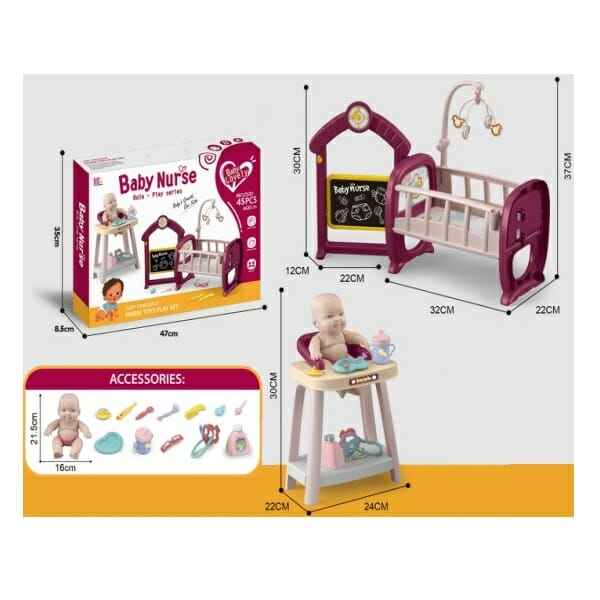 Πλήρες σετ φροντίδας μωρού με κούκλα, κρεβατάκι, καρεκλάκι φαγητού και όλα τα απαραίτητα αξεσουάρ για την ολοκληρωμένη φροντίδα και την περιποίηση του μωρού σου!