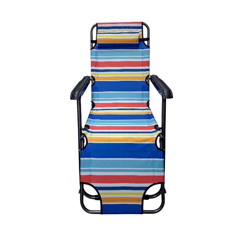 Πτυσσόμενη καρέκλα-ξαπλώστρα με επεκτεινόμενη πλάτη και στήριγμα ποδιών που μετατρέπεται εύκολα σε ανάκλιντρο. Διαθέτει αφαιρούμενο μαξιλαράκι, αδιάβροχο ύφασμα και στιβαρό σιδερένιο σκελετό, αντοχής έως 100 kg.