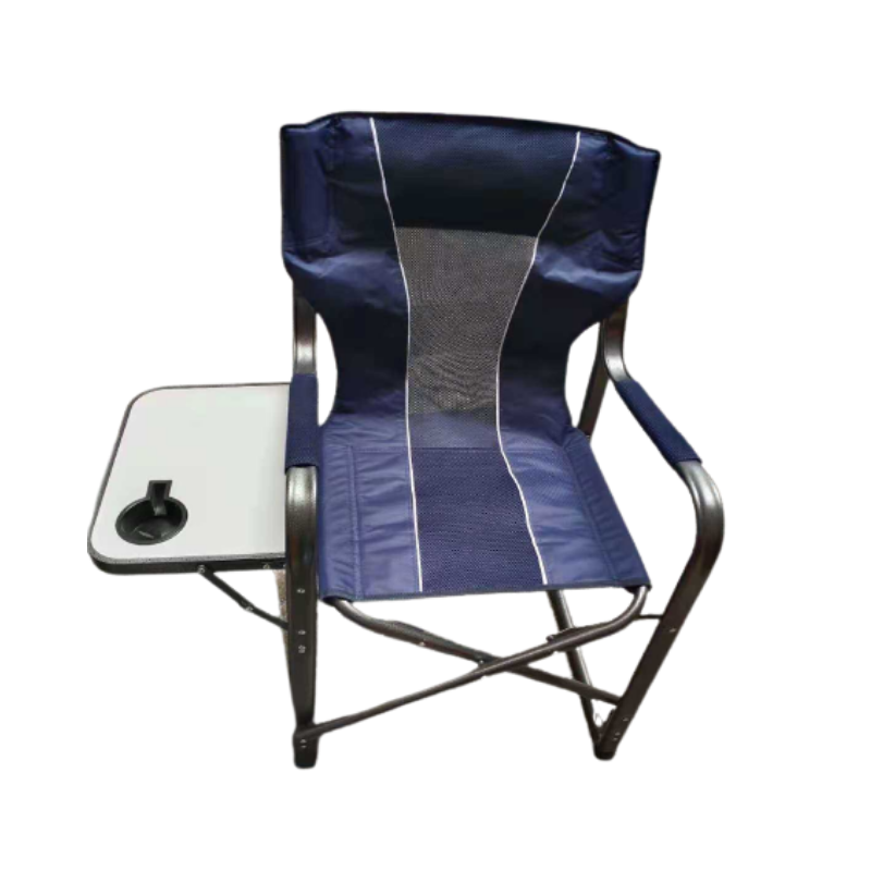 Πτυσσόμενη καρέκλα camping με ενσωματωμένο πτυσσόμενο τραπεζάκι στη δεξιά πλευρά και ποτηροθήκη, κατασκευασμένη από ανθεκτικό, αδιάβροχο ύφασμα με διχτυωτό τμήμα για αναπνοή. Στιβαρός σιδερένιος σκελετός που διπλώνει με