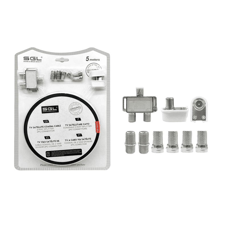 Σετ σύνδεσης κεραίας τηλεόρασης με καλώδιο μήκους 5m και διακλαδωτή 2 εξόδων. Χρώμα: Λευκό.