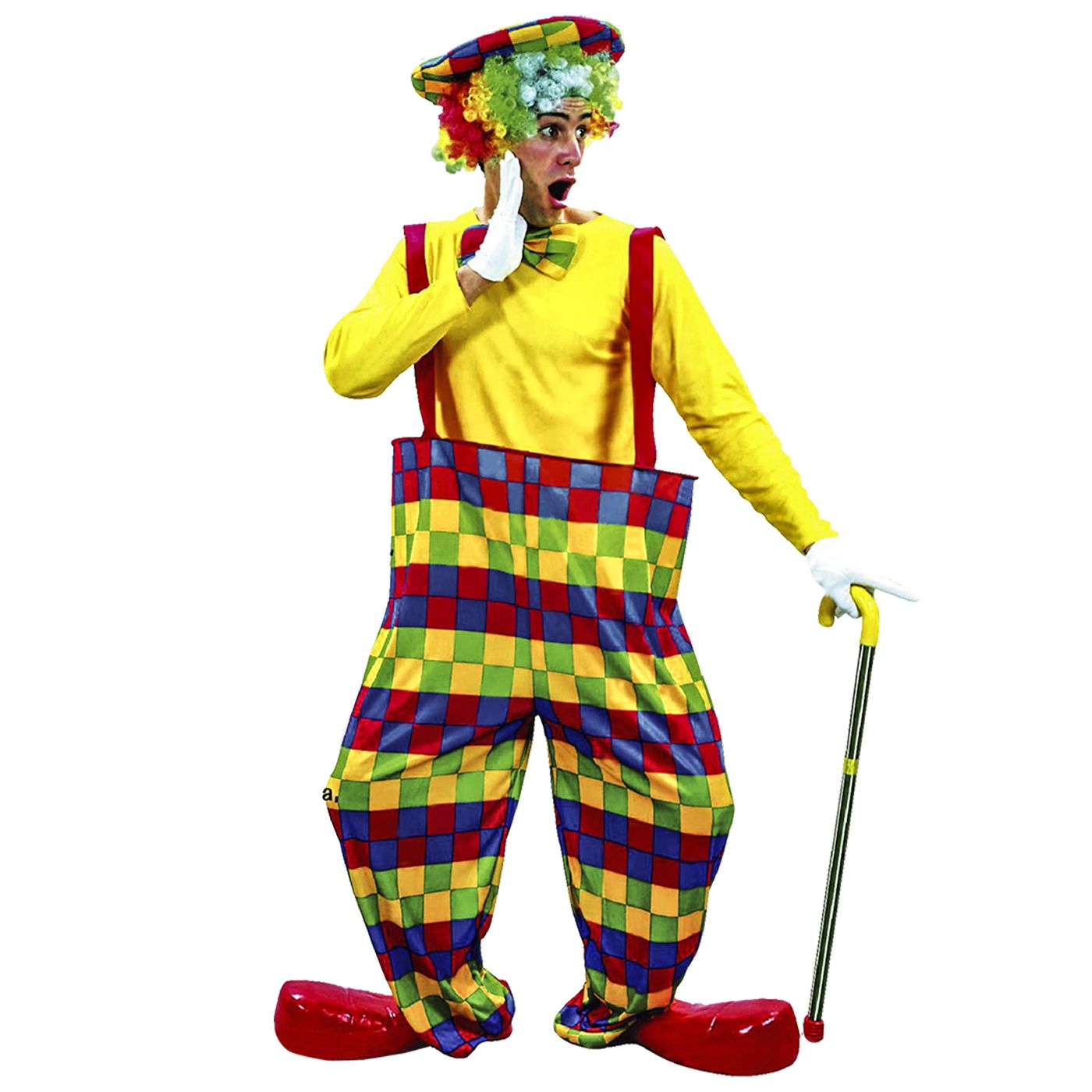 Costume da clown da uomo con pantaloni larghi e bretelle, papillon e cappello — ideale per apparizioni di Carnevale, spettacoli teatrali e feste.