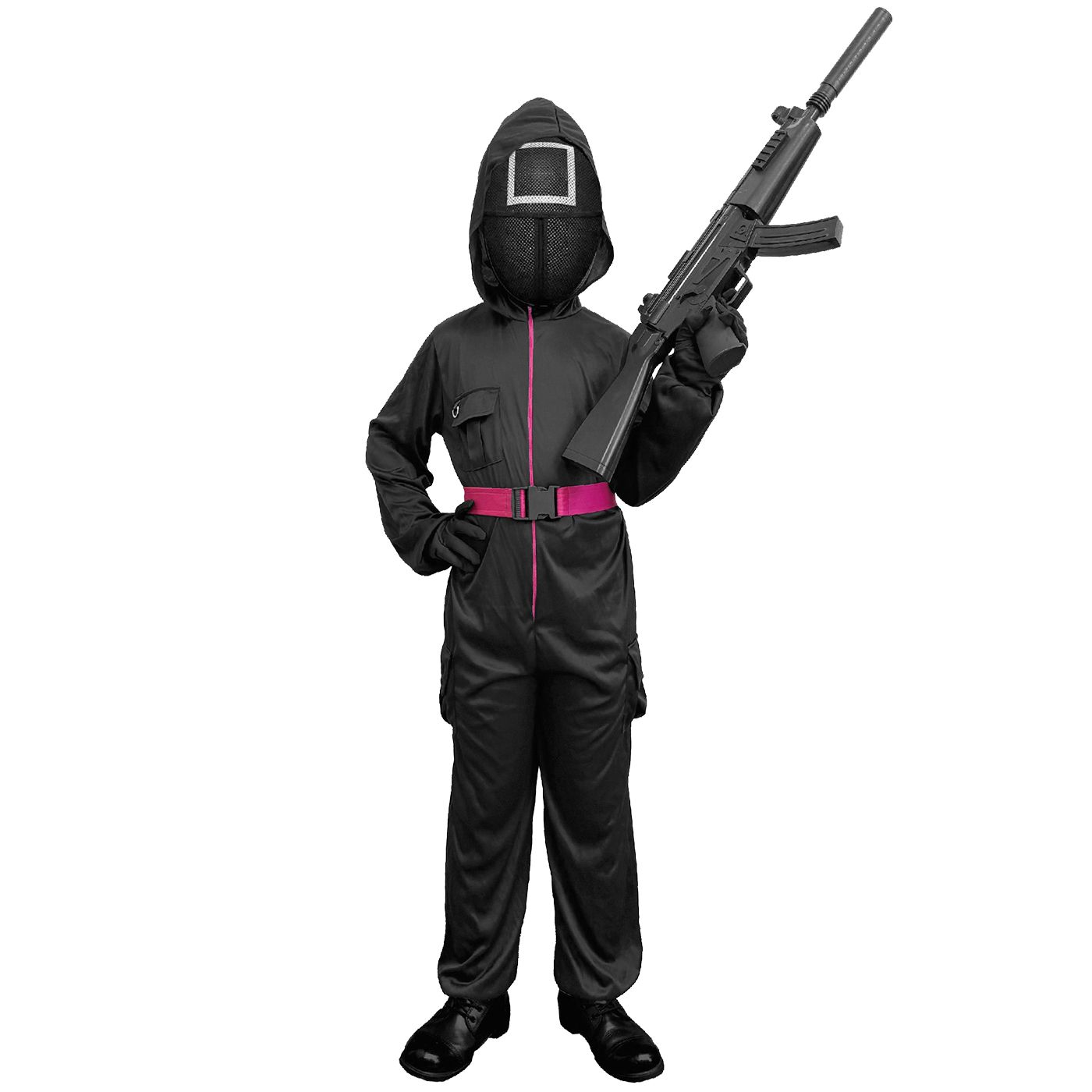 Μαύρος στρατιώτης. Περιέχει: ολόσωμη φόρμα με κουκούλα, γάντια, ζώνη, μάσκα