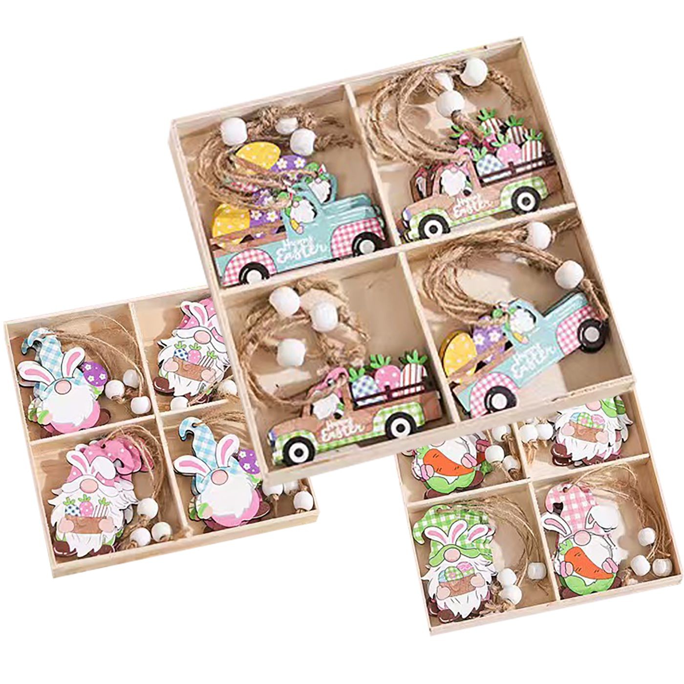 Σετ 12 ξύλινα κρεμαστά στολίδια (αμάξια και λαγουδάκια), διαμέτρου 6 cm, σε ξύλινο display. Ιδανικά για εποχιακή ή παιδική διακόσμηση και εύκολα στο κρέμασμα.