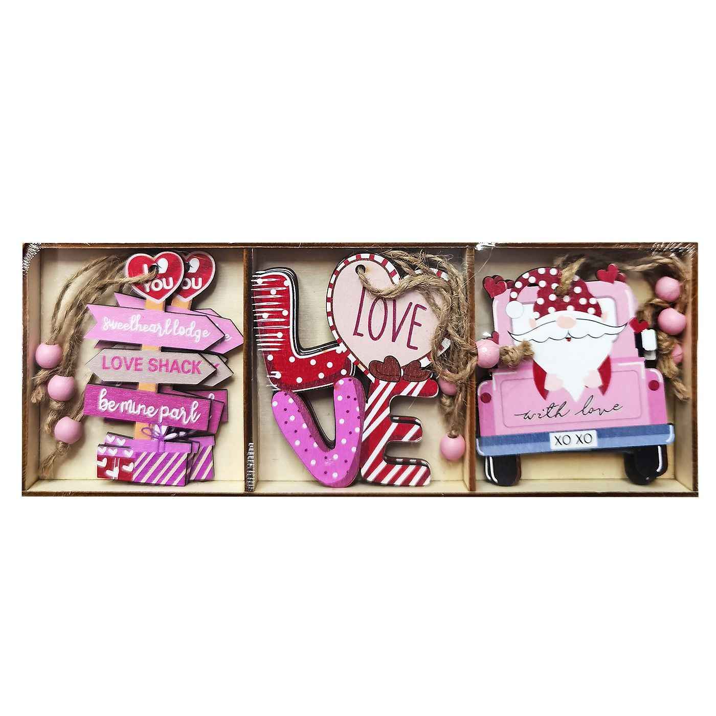 Set di 9 decorazioni appese in legno su espositore in legno, diametro 8,5 cm, tonalità rosa.