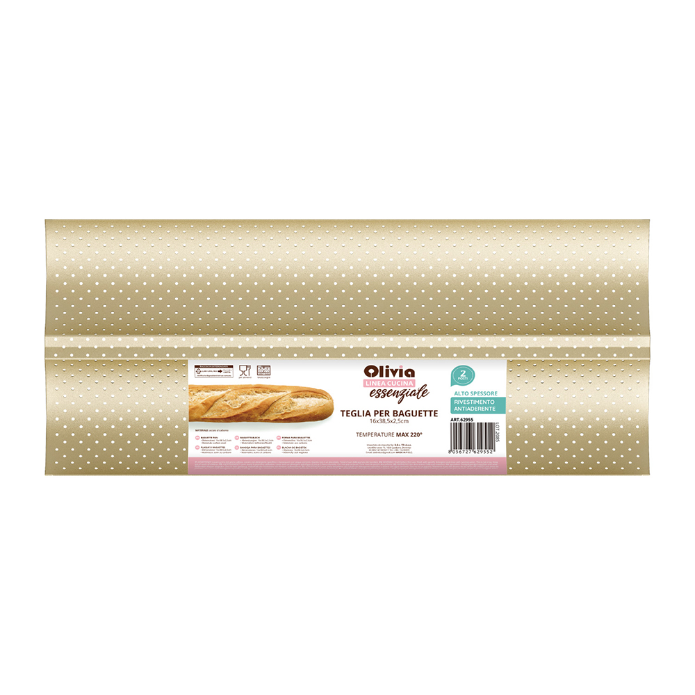 Το Ταψί Μπαγκέτα Olivia της σειράς Κουζίνα Βασική MODO έχει σχεδιαστεί για όσους επιθυμούν να φτιάχνουν στο σπίτι μπαγκέτες τέλεια ψημένες και καλοσχηματισμένες. Χάρη στη δομή διπλής φωλιάς, επιτρέπει τη στήριξη δύο φρατζολών κατά τη διάρκεια της ζύμωσης και του ψησίματος, βοηθώντας τις να διατηρήσουν το χαρακτηριστικό στρογγυλεμένο σχήμα χωρίς να πλατύνουν στα πλάγια.