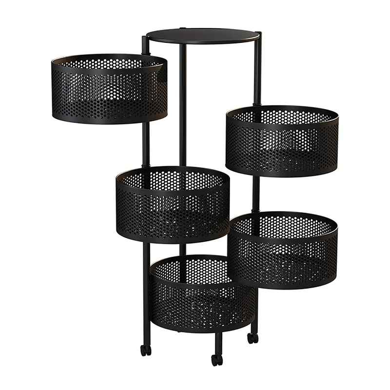 Μεταλλική ραφιέρα με 5 στρογγυλά ράφια και 4 ρόδες για εύκολη μετακίνηση. Εργονομικός σχεδιασμός με πτυσσόμενα ράφια που ανοίγουν στο πλάι για εξοικονόμηση χώρου και εύκολη καθημερινή χρήση, με ράφια μεγάλης χωρητικότητας και περιστρεφόμενες ρόδες 360° με στοπ ασφαλείας. Ιδανική για την κουζίνα, την αποθήκη, το μπαλκόνι σας ή οποιοδήποτε χώρο επιθυμείτε. Διαστάσεις: Ύψος: 90cm – Διάμετρος ραφιού: 30cm – Βάθος ραφιού: 14cm.
