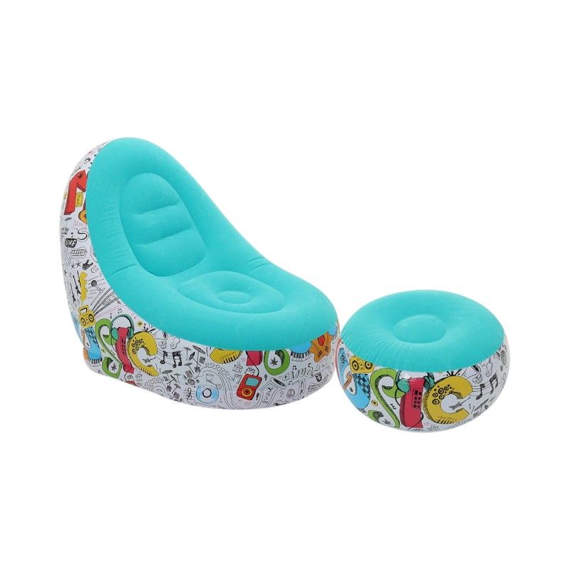 Φουσκωτή πολυθρόνα σετ με υποπόδιο, από αδιάβροχο και ανθεκτικό υλικό με μαλακή βελουτέ επίστρωση. Ιδανική για κήπο, βεράντα, παραλία και camping — διαστάσεις πολυθρόνας 85×110×98 cm.