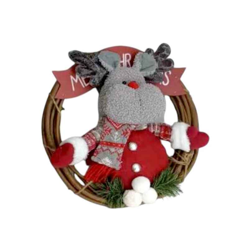 Χριστουγεννιάτικο ξύλινο διακοσμητικό στεφάνι διαμέτρου 30cm, με λούτρινη φιγούρα και στολίδια.