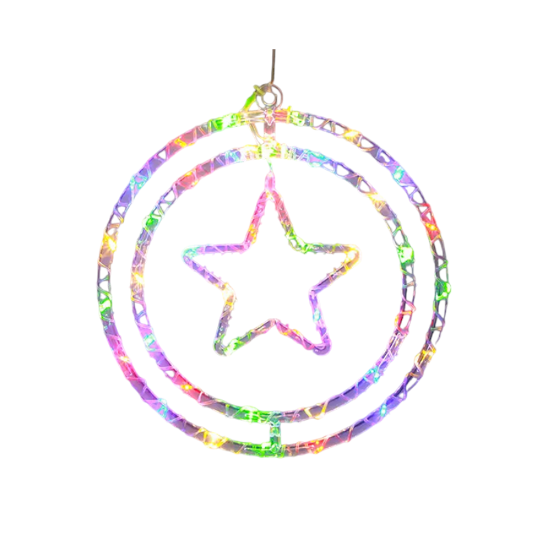 Χριστουγεννιάτικο φωτεινό διακοσμητικό 3D LED με διαφανείς κρίκους και σχέδιο. Πολύχρωμος φωτισμός που αντανακλά στη διαφάνεια και δημιουργεί ενα εντυπωσιακό εφέ. Διάμετρος: 32cm.
