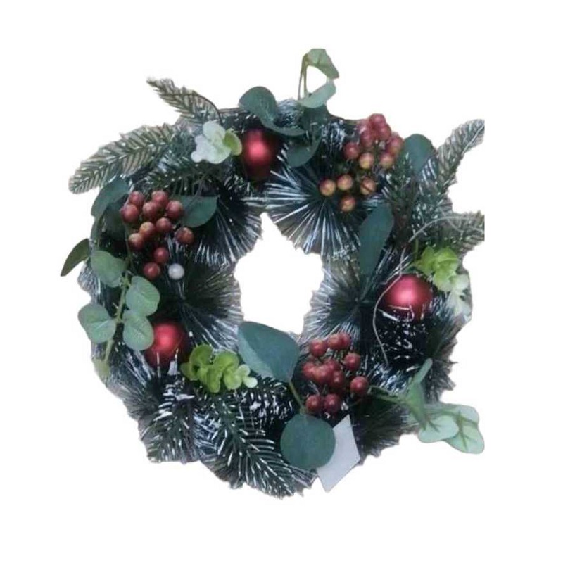 Χριστουγεννιάτικο διακοσμητικό στεφάνι διαμέτρου 30cm, με κλαδιά ελάτου και πλούσια διακόσμηση με άνθη και στολίδια.
