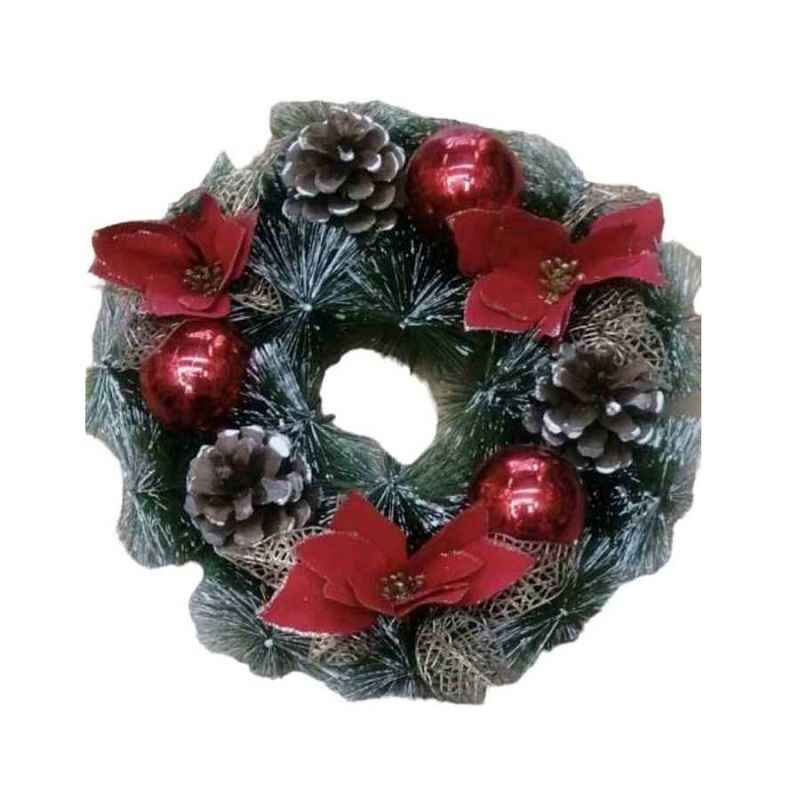 Χριστουγεννιάτικο διακοσμητικό στεφάνι διαμέτρου 30cm, με κλαδιά ελάτου και πλούσια διακόσμηση με άνθη και στολίδια.
