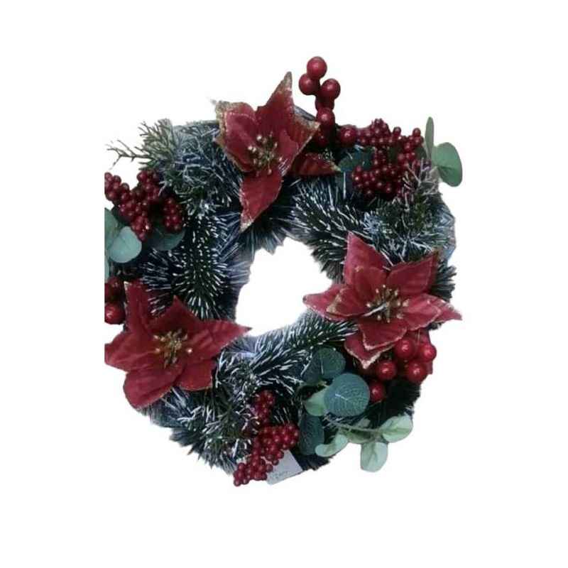 Χριστουγεννιάτικο διακοσμητικό στεφάνι διαμέτρου 30cm, με κλαδιά ελάτου και πλούσια διακόσμηση με άνθη και στολίδια.