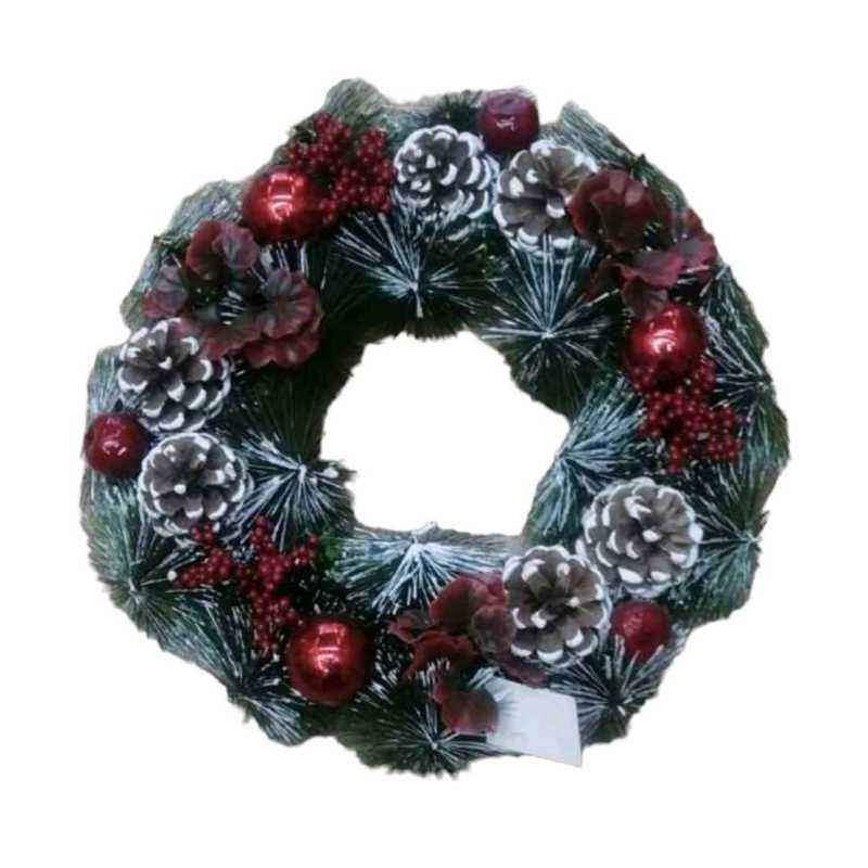 Χριστουγεννιάτικο διακοσμητικό στεφάνι διαμέτρου 40cm, με κλαδιά ελάτου και πλούσια διακόσμηση με άνθη και στολίδια.
