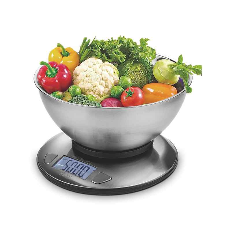 Ψηφιακή ζυγαριά κουζίνας υψηλής ακριβείας με μεγάλη ευανάγνωστη ψηφιακή οθόνη LCD και πρακτικό ανοξείδωτο κάδο ζύγισης.