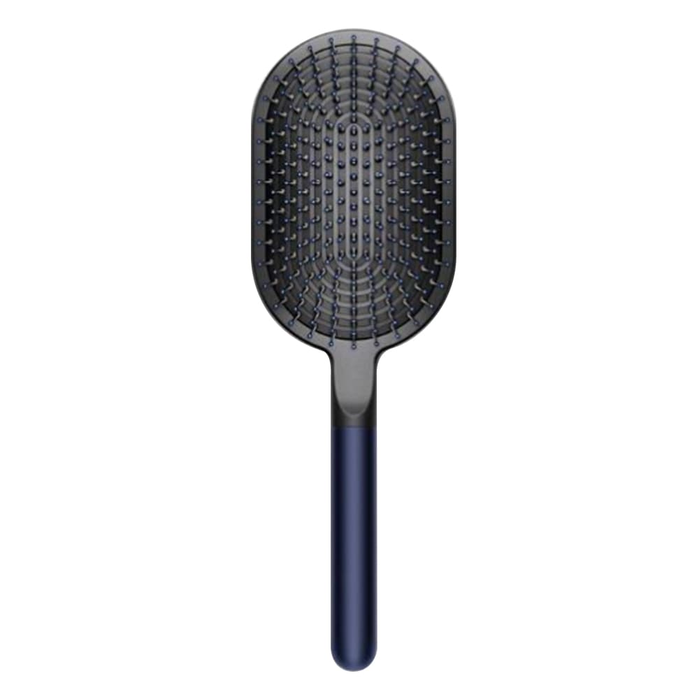 Επίπεδη βούρτσα μαλλιών Dyson σε μαύρο και σκούρο μπλε με αεροϋποδοχή για άνεση, επιβαρυμένη λαβή για καλύτερο ζύγισμα και αντοχή στη θερμοκρασία έως 150°C — ιδανική για καθημερινό styling και επαγγελματική χρήση.